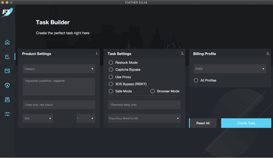 As you open the bot, you are introduced to F3ather's homepage in which you are given the ability to create, edit, and delete tasks with ease. On the left margin, you can navigate to the settings, proxies, and profile creation tab. The settings tab allows for changing delays and webhook information. The proxies tab allows for importing, exporting, and testing proxies. While the profiles tab allows for creating, deleting, importing, and exporting users' profiles.