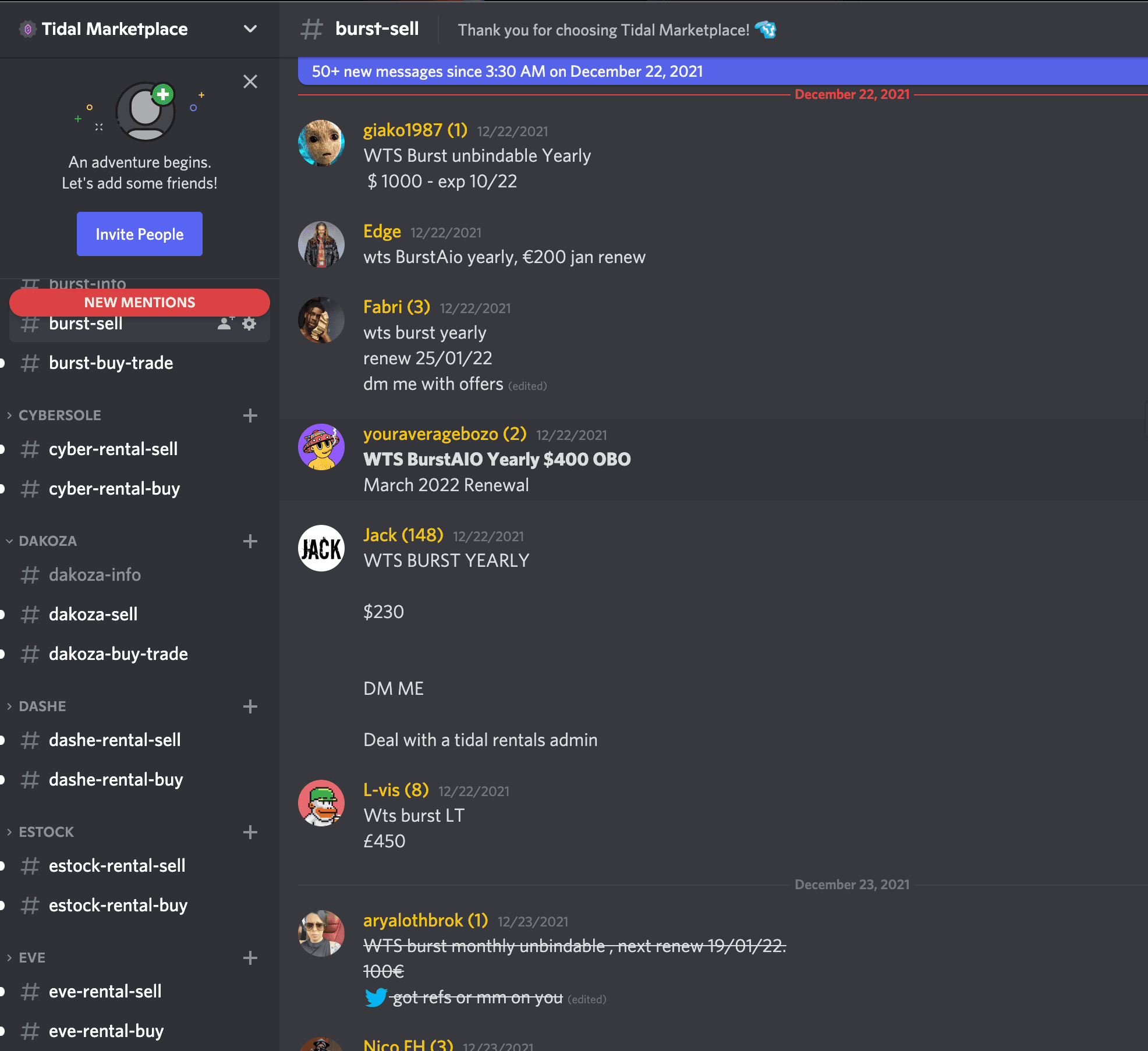 There are many places you can rent shoe bots, and this list is constantly expanding over time. Initially, there were two main areas, which are Botmart and Tidal marketplace. These both are discord servers that have a middleman to oversee the trades of many sneaker bots. They have channels divided up for each bot so you can easily navigate to the category for the bot you are interested in, and you can see channels for the bots you want to sell, buy or rent within that category! We now only recommend using these servers to buy and sell bots, but for renting there are far better options!